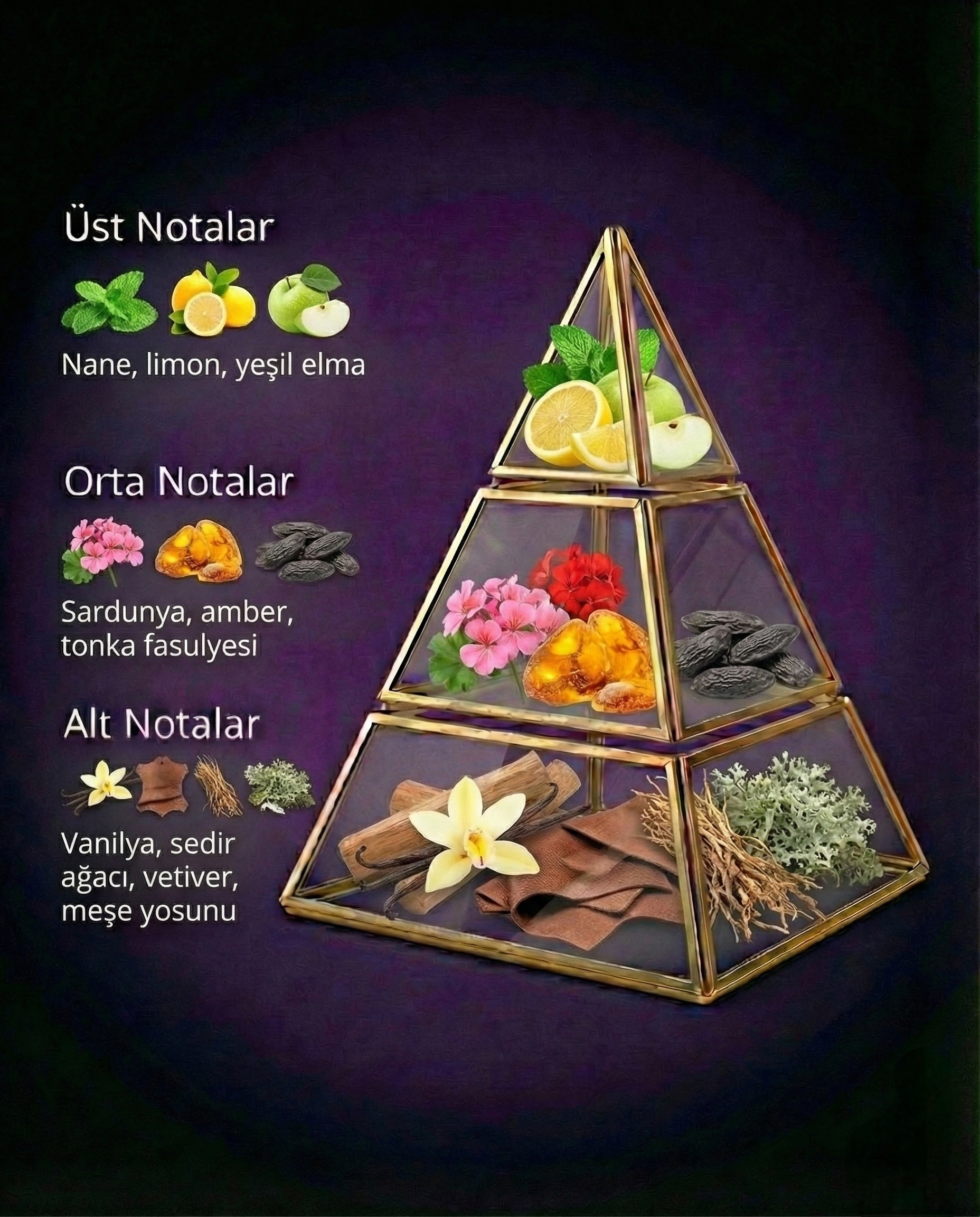 SAFRON, nane ve limonun taze ve enerjik patlamasıyla açılır; yeşil elmanın canlı dokusu bu ferahlığı modern bir çekiciliğe dönüştürür. Kalp notalarında tonka fasulyesi ve amberin sıcaklığı devreye girerek yoğun, büyüleyici ve erkeksi bir derinlik oluşturur.